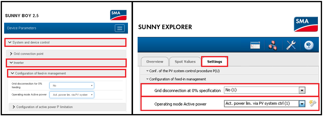 For the WebUI navigate to System and device control > Inverter > Configuration of feed-in management. For Sunny Explorer navigate to Equipment & device control system (solar inverters) > Configuration of active power P limitation > Configuration of feed-in management.