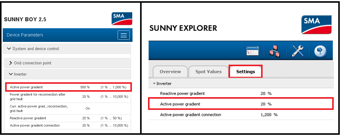 - Active power gradient = a value of 200% should ensure the inverter will respond within 3 to 10 seconds
